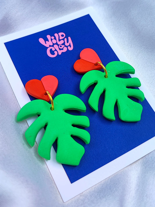 Monstera Earrings with Two Tone Heart Stud